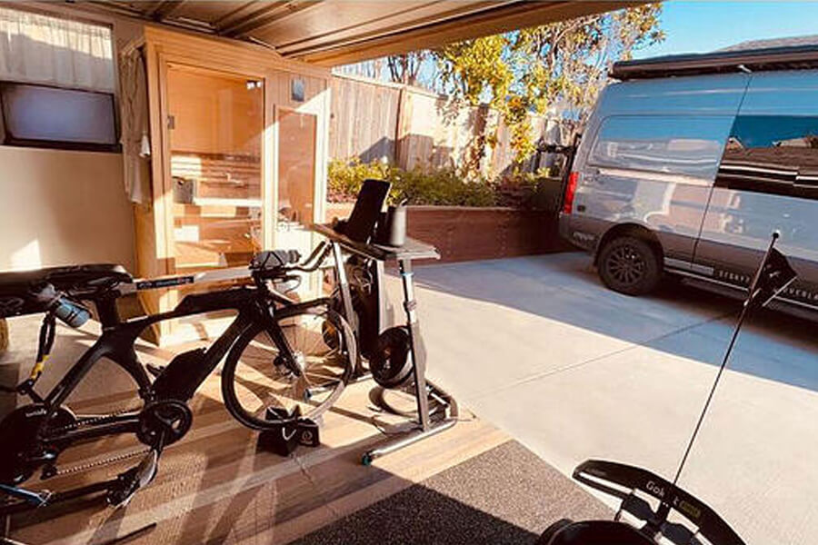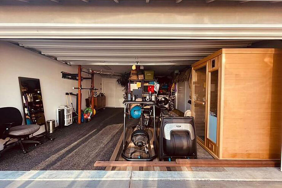 The Hallmark 44 sauna fits PERFECTLY in the area of the garage between a window and the garage door sensors. It even fits seamlessly in the vertical direction. When garage door is left open, and it is at times, natural light is allowed to peak through more so than just the frosted windows when door is closed. The sauna complements the other pieces of the garage gym which include a Vasa swim trainer, the race bike attached to a Wahoo Kickr, a Rogue Monster Lite folding rack, and numerous other pieces I use personally and professionally as a physical therapist/strength and conditioning coach. Safe to say, the cars remain outside and are less important than what’s in the gym and the lifestyle that comes with it.
